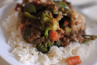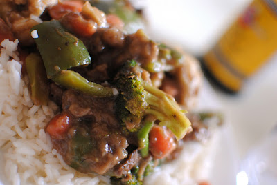 Saute beef in a large wok over medium-high until done. Set aside. Saute veggies in olive oil until tender over medium heat. Return beef to wok. Combine water, ginger, flour, soy sauce, sugar, and pepper and mix well. Pour sauce mixture over beef and veggies in wok. Toss well to coat everything. Heat until sauce has thickened (sauce will continue to thicken once served).